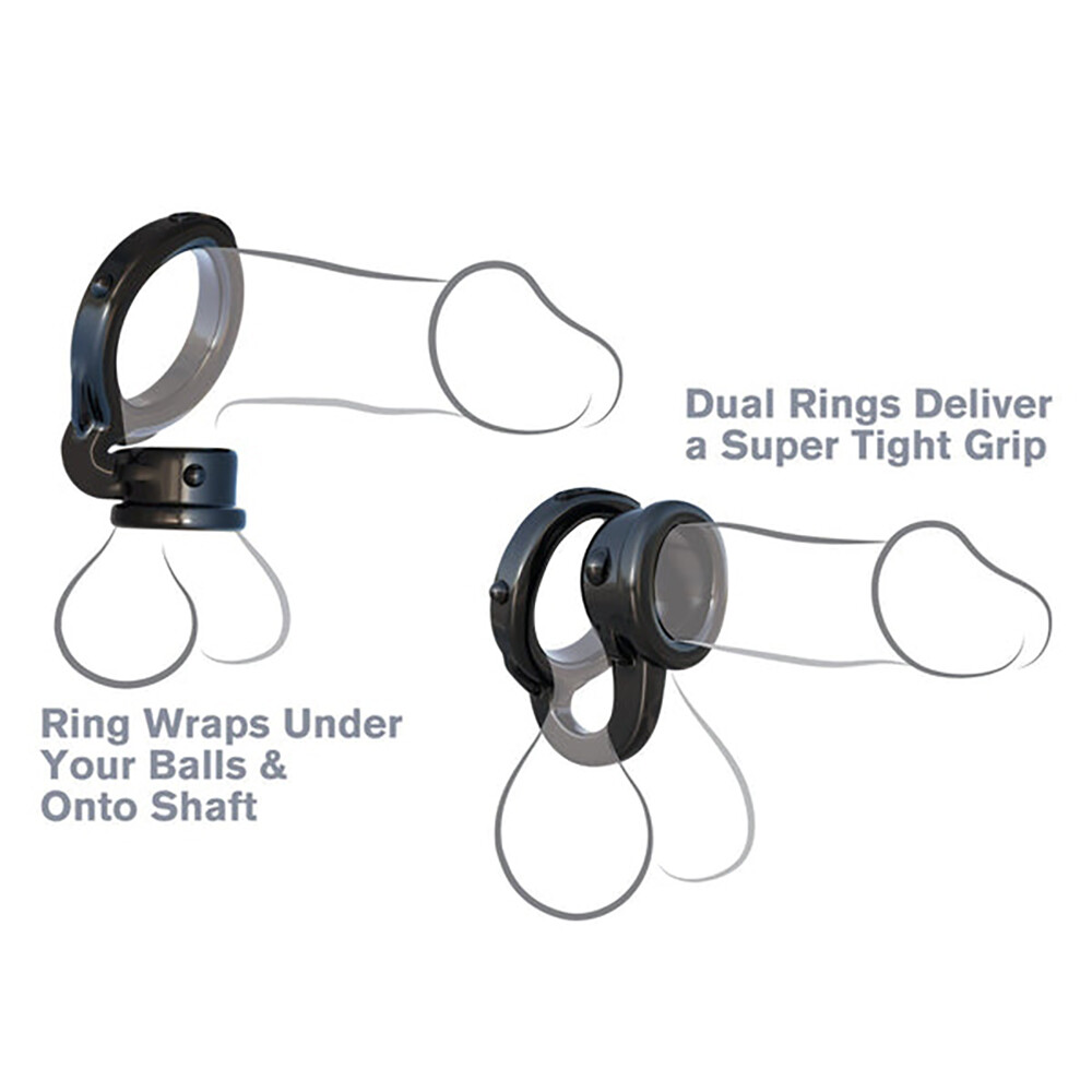 El Anillo Doble Ironman se puede usar de varias maneras. Envuelve el anillo grande alrededor de todo tu paquete mientras el anillo inferior pasa por debajo de tus testículos, acunando tu escroto y separando cada testículo. También puedes estirar el anillo inferior y pasar tus testículos a través de él.
