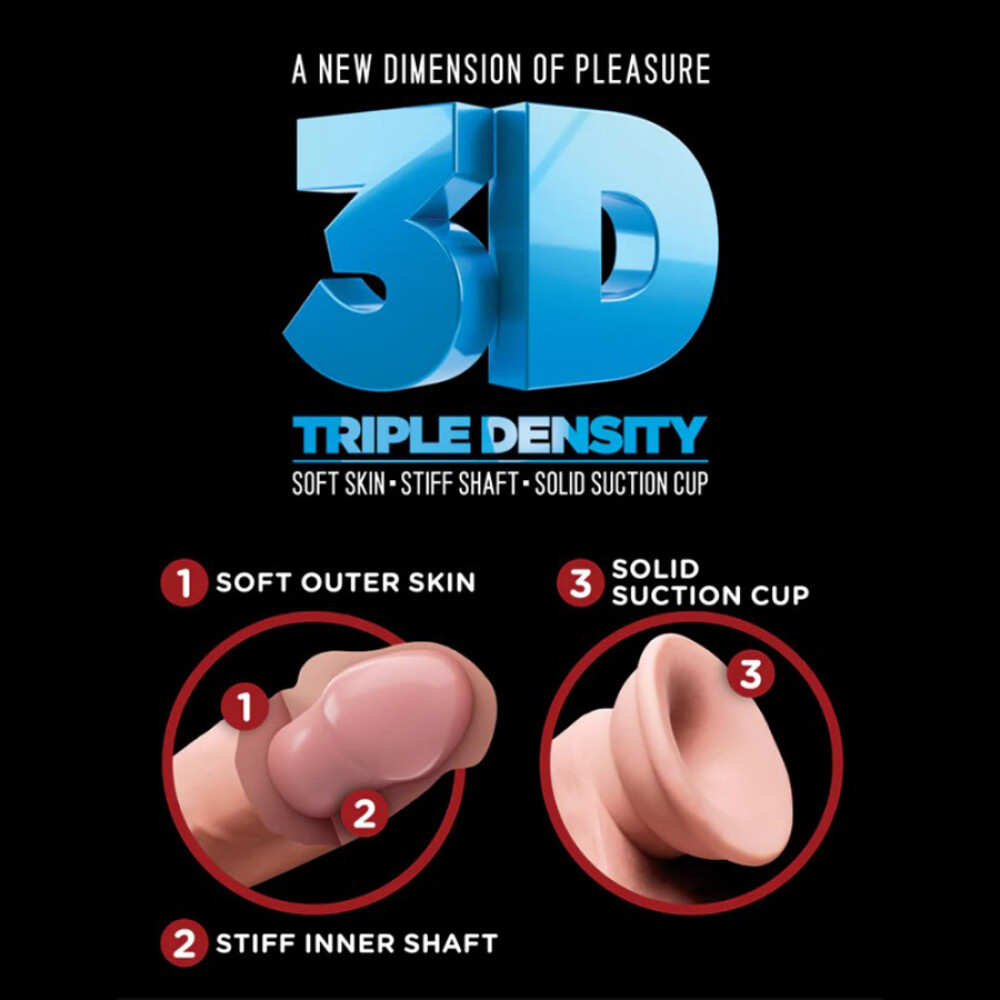 El King Cock® Plus 8" Triple Density Cock with Balls está hecho del nuevo y mejorado material Fanta Flesh®, lo que lo hace rígido por dentro y suave por fuera. La piel exterior realista es suave al tacto, mientras que el eje interior es rígido y erecto como un pene real, lo que hace que su experiencia de placer sea lo más real posible.