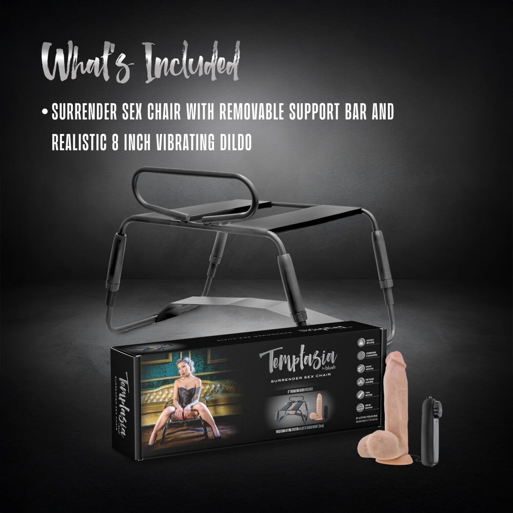 La silla sexual Surrender es compatible con todos los consoladores y vibradores con ventosa e incluye un consolador vibrador realista de 20 cm que puedes acoplar para dar rienda suelta a tu fantasía. Añade a tu pareja debajo para una penetración y sexo oral increíbles. Su robusta construcción de hierro garantiza una experiencia segura y duradera, permitiéndote disfrutar plenamente del momento sin preocupaciones. Desata tus deseos, abraza las posibilidades y entrégate a un mundo de placer sin igual fuera de la cama con esta extraordinaria silla de Blush.